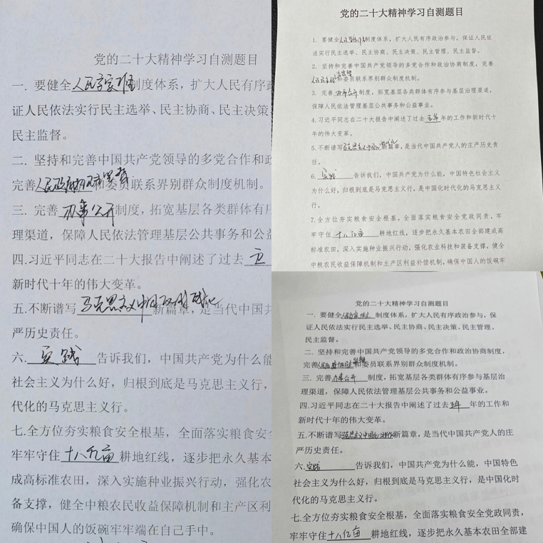 开展答卷测试,检验学习成效。招标咨询集团第三党支部所属咨询中心采取线上视频会议的方式组织全体党员居家学习党的二十大报告原文,通过学原文、悟原理、反复学、时常悟,深刻领会和准确把握报告的精神实质、丰富内涵和核心要义。同时,对党的二十大报告相关知识开展应知应会测试,通过答卷的方式检验党员干部对党的二十大精神的理解和把握,达到以考促学、以学促用、学用结合、知行合一的目的。