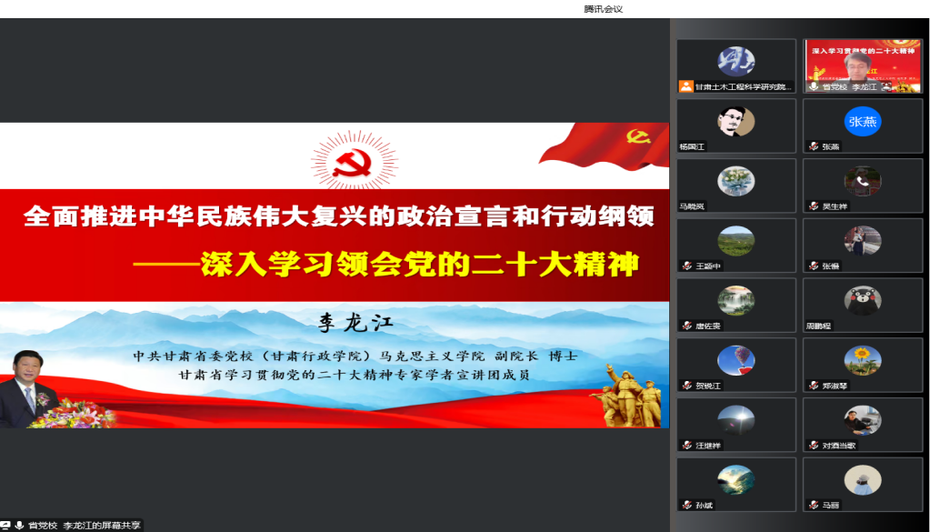 会议邀请省委党校马克思主义学院副院长、全省学习贯彻党的二十大精神专家学者宣讲团成员李龙江教授作了题为《全面推进中华民族伟大复兴的政治宣言和行动纲领——深入学习领会党的二十大精神》的专题讲座。以党的二十大报告为主线,结合国有企业高质量发展具体事例,对党的二十大精神进行了全面深入、系统详尽的阐释解读,使全体党员干部职工从多方面、多角度对党的二十大精神的核心要义有了更为清晰和深刻的认识,对进一步全面学习、全面把握、全面落实党的二十大精神起到了积极指导作用。