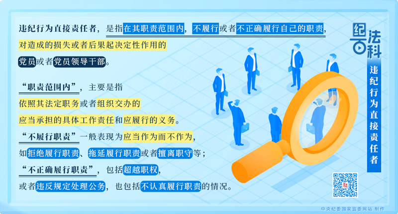 违纪行为直接责任者,是指在其职责范围内,不履行或者不正确履行自己的职责,对造成的损失或者后果起决定性作用的党员或者党员领导干部。