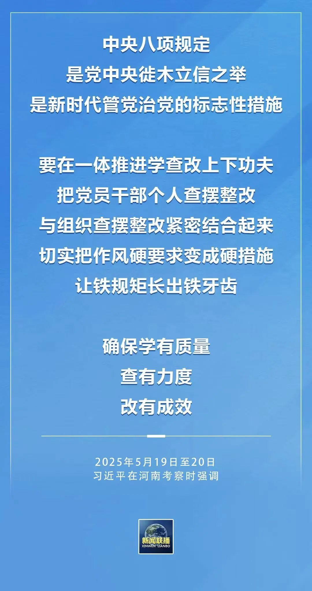 习近平总书记在河南考察时对深入贯彻中央八项规定精神学习教育提出明确要求,强调“要在一体推进学查改上下功夫”“确保学有质量、查有力度、改有成效”。