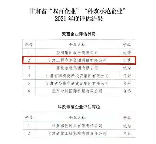 甘肃工程咨询集团获甘肃省2021年度“双百企业”评估“优秀”等级