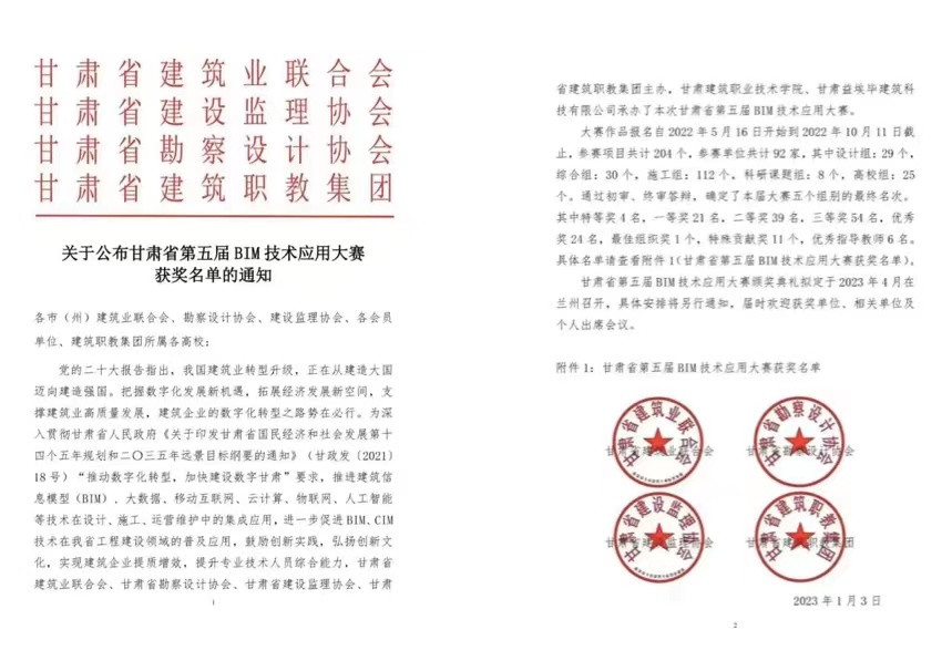 日前,甘肃省第五届BIM技术应用大赛结果公布,甘肃工程咨询集团共获得14个奖项,其中,“BIM技术在东乡县沿洮河经济带棚户区改造二期(调整)项目设计阶段的应用”等8个项目分别获设计组一、二、三等奖,“同心抗疫,智慧建造—甘肃省疾病预防控制中心公共卫生中心项目BIM综合应用”等3个项目分别获综合组特等奖及一、二等奖,“数字化转型背景下的勘察设计企业BIM技术推广路径探究”等2个项目分别获科研课题组二、三等奖,建筑设计院获特殊贡献奖。
