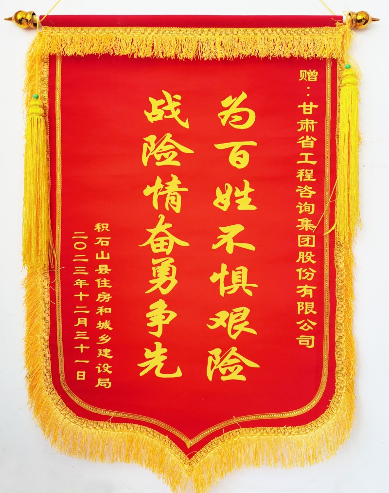 1月3日上午,积石山县住房和城乡建设局向甘肃工程咨询集团赠送“为百姓不惧艰险,战险情奋勇争先”锦旗,并发来《感谢信》,对在抗震救灾关键时刻奔赴灾区开展房屋应急评估工作的专家表达感谢和敬意。