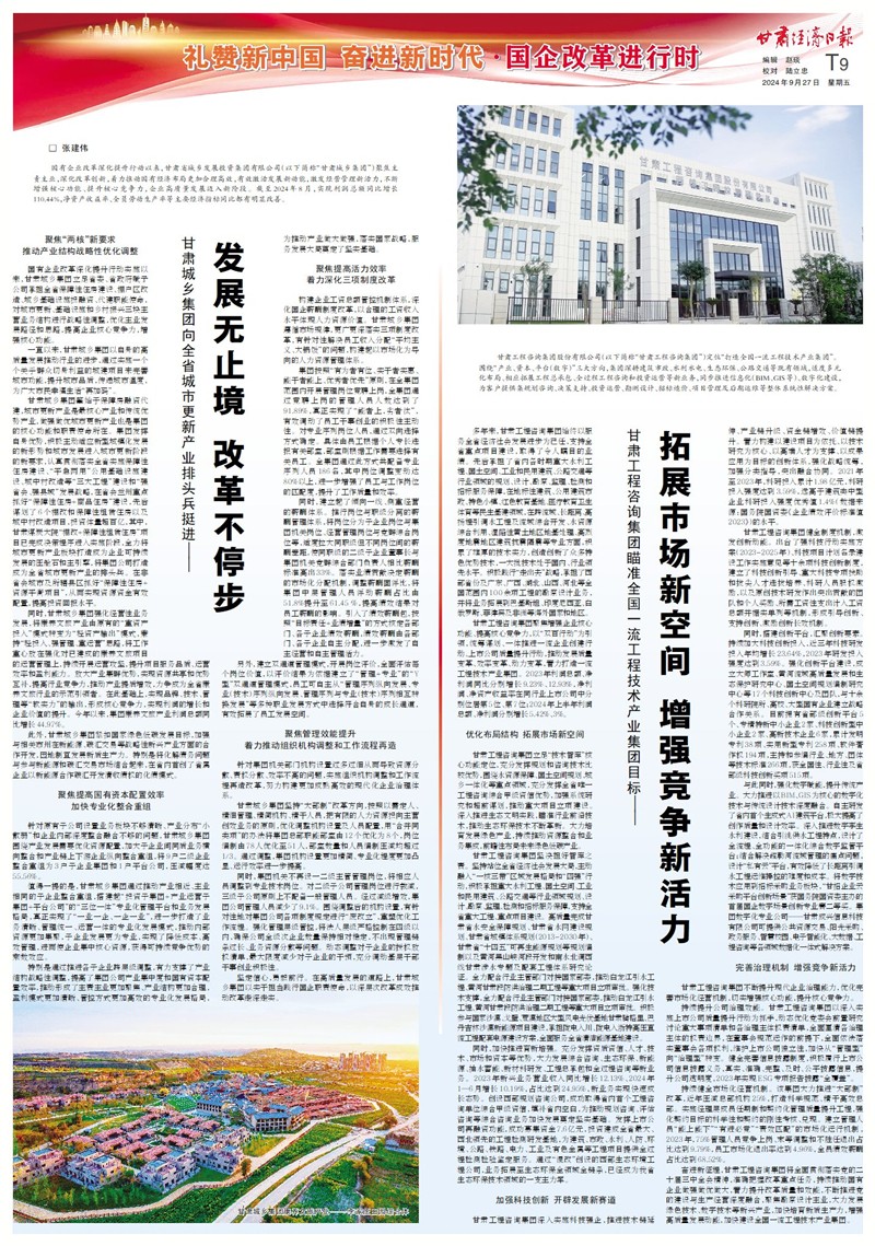 奋进新征程,甘肃工程咨询集团将全面贯彻落实党的二十届三中全会精神,准确把握改革重点任务,持续推动国有企业做强做优做大,着力提升改革质量和效能,不断推进党的建设与生产经营深度融合,聚焦勘察设计主业,大力发展绿色技术、数字技术等新兴产业,加快培育新质生产力,增强高质量发展动能,加快建设全国一流工程技术产业集团。