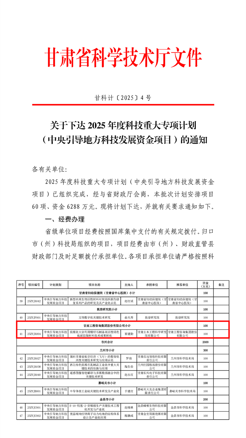 近日,甘肃省科技厅公布了2025年度科技重大专项计划(中央引导地方科技发展资金项目)立项名单,甘肃工程咨询集团土木工程院主持申报的“资源化大宗利用煤矸石制备高活性绿色低碳胶凝材料技术成果转化”项目成功立项。