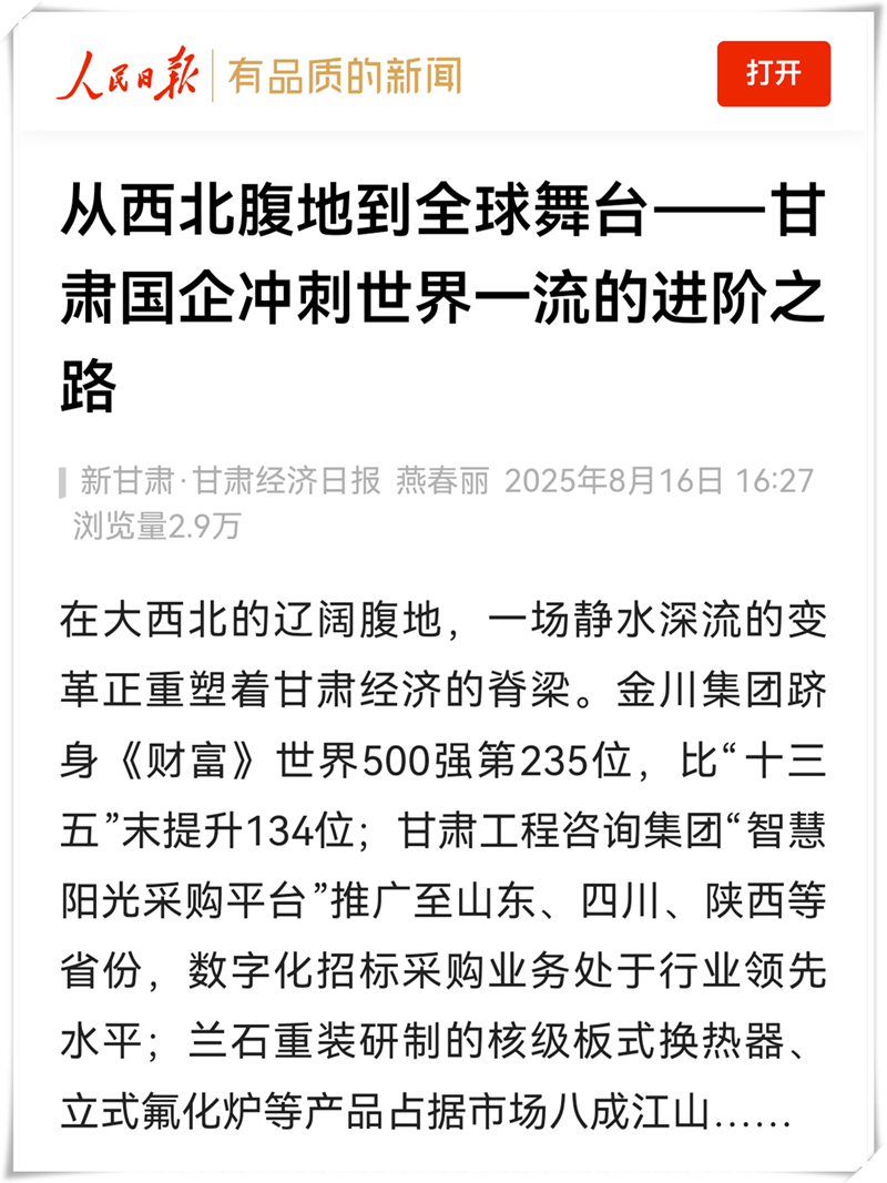 在大西北的辽阔腹地,一场静水深流的变革正重塑着甘肃经济的脊梁。金川集团跻身《财富》世界500强第235位,比“十三五”末提升134位;甘肃工程咨询集团“智慧阳光采购平台”推广至山东、四川、陕西等省份,数字化招标采购业务处于行业领先水平;兰石重装研制的核级板式换热器、立式氟化炉等产品占据市场八成江山……