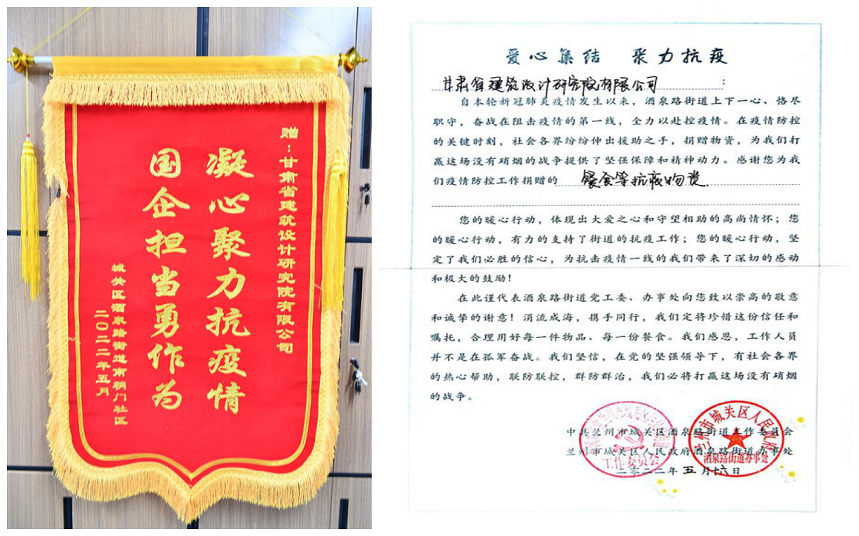 凝心聚力抗疫情 国企担当勇作为:酒泉路街道向甘肃省建筑设计研究院有限公司赠送锦旗