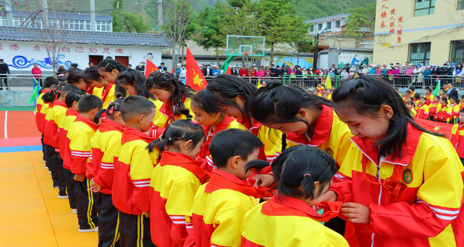 活动现场,在庄严激昂的国歌声中举行了升国旗仪式。简单而又隆重的入队仪式上,鲜红的队旗迎风飘扬,随着入队队员名单的宣布,许多一年级的同学成为了光荣的中国少年先锋队队员,并由高年级的少先队员为他们戴上了鲜艳的红领巾。随后,大队辅导员带领新队员宣誓,响亮的呼号声“时刻准备着”响彻校园上空,集中展示了新时代少先队员积极向上的精神风貌,全体师生为他们送上最深的祝福。最后,新队员代表发言,标准的队礼、坚定的眼神、稚嫩的声音表达了最大的决心,号召全体新队员要在星星火炬的指引下刻苦读书,从小听党话、感党恩、跟党走,努力成长为中国特色社会主义事业建设者和接班人。