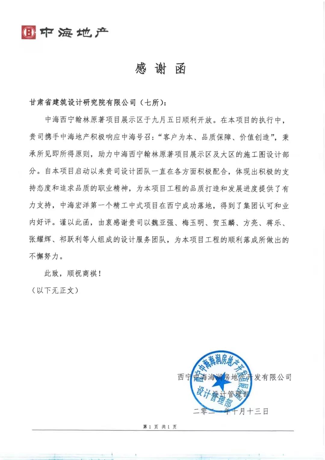 日前,建筑设计院收到来自西宁中海地产的一封感谢信,赞扬设计七所魏亚强、梅玉明、贺玉麟、方亮、蒋乐、张耀辉、祁跃利组成的设计团队在中海西宁翰林原著项目展示区及大区施工设计中的突出表现。