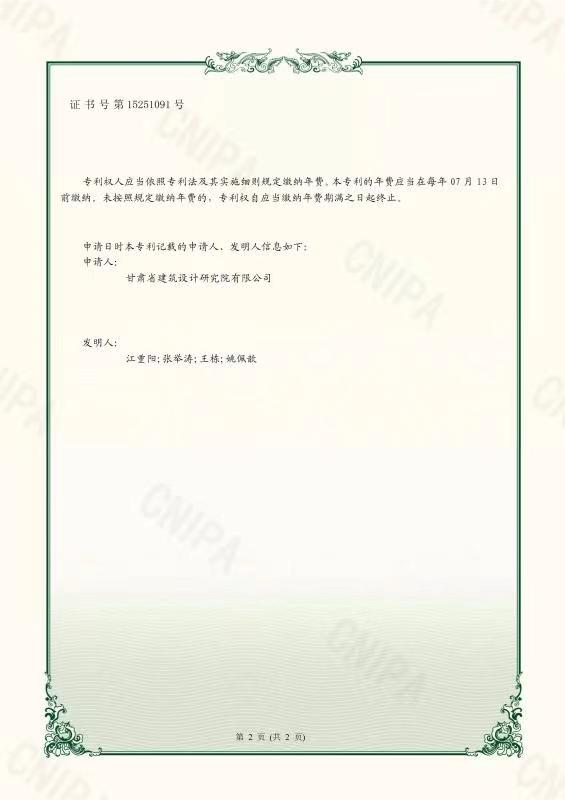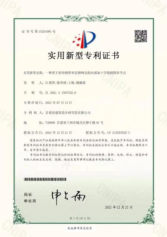 近日,从国家知识产权局传来好消息,由建筑设计院总工程师张举涛、设计四所总工程师江重阳、设计五院总工程师王栋、设计四所工程师姚佩歆联合申报的“一种用于矩形钢管单层钢网壳的内部加十字肋圆筒形节点”技术,喜获国家实用新型专利。