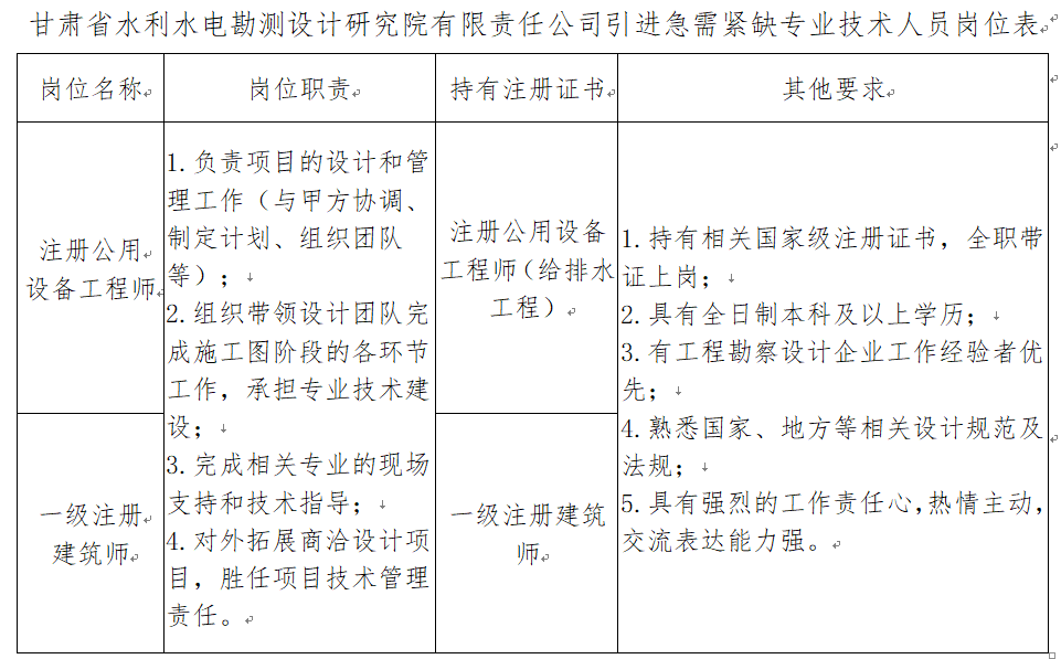 甘肃省水利水电勘测设计研究院有限责任公司因工作需要,根据公司《员工招聘与录用管理办法》,经研究决定,面向社会公开引进急需紧缺专业技术人员。现将有关事项公告如下: