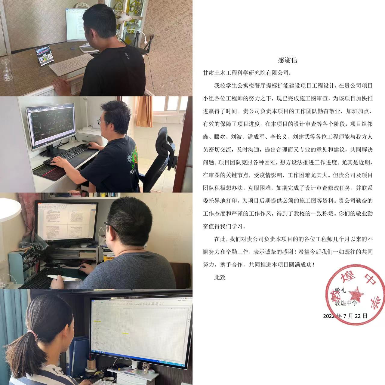 设计一所坚决贯彻土木工程院党委要求,第一时间部署疫情防控工作。在部门职工居家办公期间,积极与软件公司沟通协调,为所有设计软件增加了在线使用版,并利用钉钉、微信进行线上沟通,疫情期间完成了2022年华亭市安口镇老旧小区住宅楼棚户区改造项目施工图审查、甘肃武威工业园区天马资源开发有限公司钢结构标准化厂房建设项目、敦煌中学学生公寓楼餐厅提标扩能建设等项目,得到建设单位的一致好评和致信感谢,极大提升了部门员工技术创新、全方位服务的工作热情。