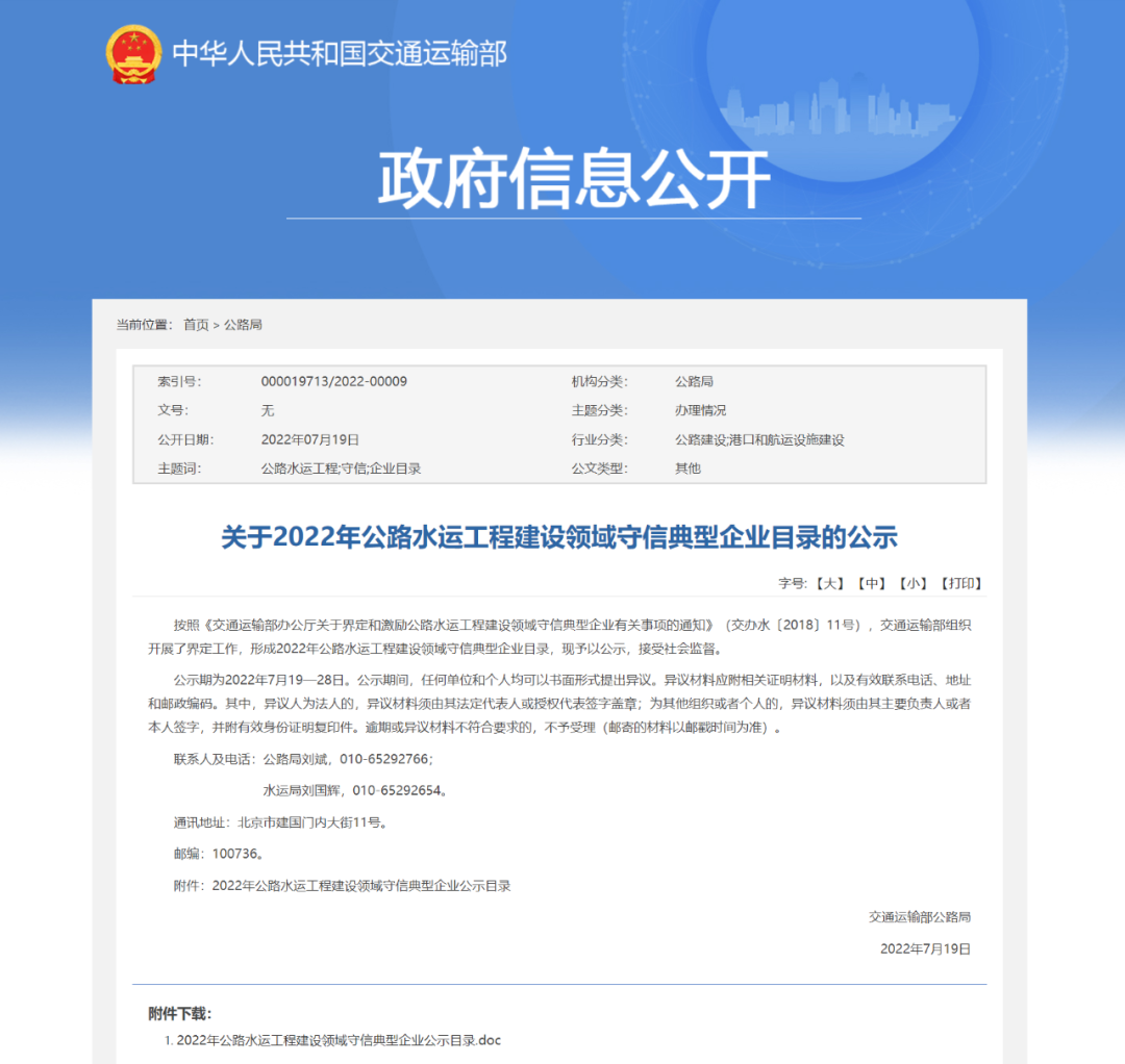近日,交通运输部公布了《关于2022年公路水运工程建设领域守信典型企业目录的公示》对获评公路水运工程建设领域守信典型的93家设计企业、93家施工企业、56家监理企业予以公示。甘肃省6家企业榜上有名,甘肃省交通工程建设监理有限公司是我省唯一一家上榜的监理企业。