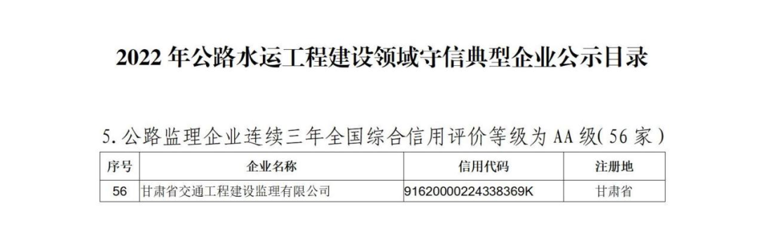 甘肃省交通工程建设监理有限公司上榜交通运输部公路水运工程建设领域守信典型企业目录