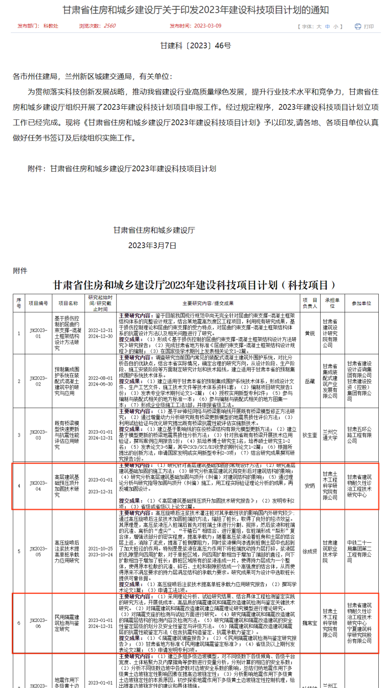 近日,从《甘肃省住房和城乡建设厅关于印发2023年建设科技项目计划的通知》(甘建科〔2023〕46号)获悉,由土木工程院组织申报的两项科技攻关项目《高层建筑基础预压顶升加固技术研究》(立项编号JK2023-03)、民用隔震建筑检测与鉴定研究(立项编号JK2023-06)和两项软课题《2022-2023年度甘肃省民用建筑能耗统计数据分析与研究》(立项编号JK2023-45)、《2022年度甘肃省建筑能耗监测平台的能耗数据分析与研究》(立项编号JK2023-46)成功获批立项。