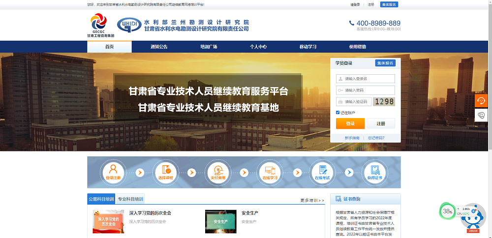 目前,平台已正式上线,网址为:http://gsgczx.lllnet.cn/。学员可在平台购买课程后,通过PC端、移动客户端等多渠道开展远程学习。完成学习任务并考核合格,即可获得基地发放的培训证书,该培训证书是甘肃省人力资源与社会保障厅认可的学分证明。平台可供2万余人学习,拥有注册登录、报名缴费、在线学习及考核(支持PC端和移动客户端)、证书打印、后台管理等功能。现有公需、专业课程4000余门,其中基地开发自制水利类课程4门10学时,能够满足各类专业技术人员的继续教育学习。