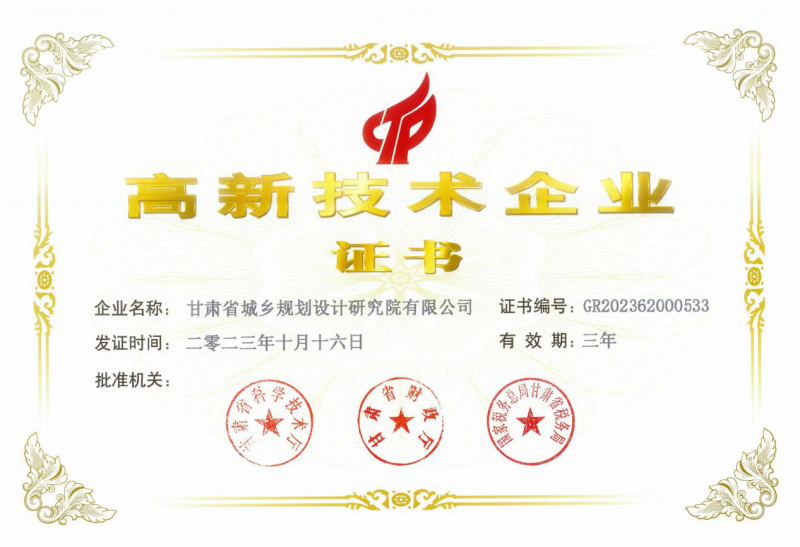 近日,经过严格的审批程序,省规划设计院申报的国家高新技术企业最终通过认定并获得由省科学技术厅、省财政厅和国家税务总局甘肃省税务局联合颁发的“高新技术企业证书”(证书编号:GR202362000533)。