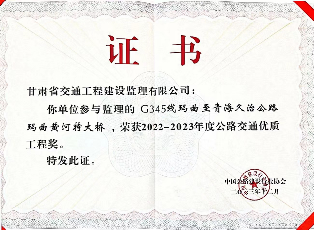 近日,中国公路建设行业协会于湖北武汉召开第五届公路建设高质量大会暨2022-2023年度公路交通优质工程奖表彰大会。省交通监理公司“代建+监理”的G345线玛曲至青海久治公路玛曲黄河特大桥荣获公路交通优质工程奖。此次获奖系公司在两徽、金阿高速公路之后第三次获得全国公路交通优质工程奖——李春奖。