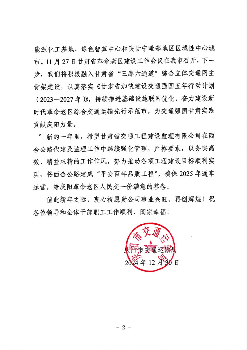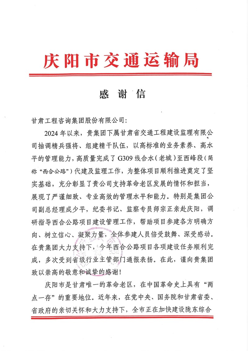 庆阳市交通运输局向甘肃工程咨询集团发来感谢信