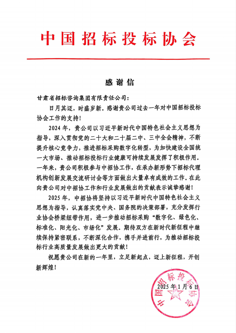 近日,省招标集团收到来自中国招标投标协会(下称“中招协”)的感谢信,感谢省招标集团作为中招协常务理事单位为招标投标行业发展作出的积极贡献。